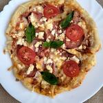 Mától szalma vagyok, minimál főzéssel. Szombatról maradt egy adagnyi kefíres (lusta) lángos. Olajat már nem akartam miatta forrósítani, úgyhogy pizza lett belőle. Sonka, kecskesajt, szósz a fagyasztóból, paradicsom és bazsalikom frissen a kertből.