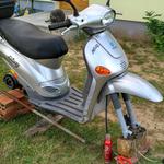 Hátul fékdob kipucolva, kilométer hajtás megzsírozva, elől féknyereg megpucolva, hátsó kerék félig visszarakva. Anyát kell meghúzni és új sasszeget rakni bele.