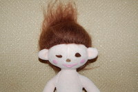 Nos, a történethez hozzátartozik, hogy egyszerre kaptam meg Ahama és Méhike babáját és a kettőnek szinte egyforma haja volt, csak más anyagból. Mintha nem is két helyről jöttek volna. :D (Ahamáénak viszont legalább volt már arca, mert a plüss feladta a leckét rendesen.) Viszont már elsőre beugrottak azok a kis manók, akik gyerekkorom valamely évtizedében voltak népszerű játékfigurák, csak műanyag testük volt (ha jól emlékszem), de ugyanilyen égnek álló barna hajuk. Ti emlékeztek ilyenre? Elsőre a hímzéssel próbálkoztam, de a plüss szőrei mindig kikandikáltak, így eszembe jutott a filc, amit a méretek miatt viszont inkább ragasztottam, mint varrtam. (Remélem nem csúfítja el a módszer.)