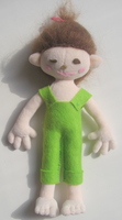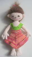 Egy kis manólány aki nagyon várja már, hogy a nagy tappancsain mezítláb szaladgálhasson a réten, de mivel a tavaszi szél még hűvös is tud lenni, kapott egy poncsót is, szörpivel festett, tolnai gyapjúfonalból, amit ha úgy adódik szoknyaként is hordhat.