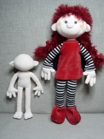 Marizsu, Az eredeti zöld hajú baba gyári, Simba márkájú. A miénknek a fejét az eredeti alapján "körberajzoltam" és kerestem hozzá méretben megfelelő test, kar, láb szabásmintát, amit most épp egy ezeréves Burdában találtam egy waldorf babánál, de Blanka nem akart waldorfos babafejet.