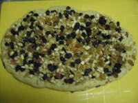 500 g mazsola (nagyszemü) 100 g Korinthen (kisszemü mazsola) 100 g citronat (kandírozott citromhéj) 100 g orangeat (kandírozott narancshéj) 250 g mandula (meghámozva, felvágva) 2 csomag vaníliás cukor 6 ek barna rum 12 csepp keserümandula-olaj 1 kiló liszt (fehér, normális) 2 darab friss élesztö 400 g puha vaj 150 g cukor 0,25 l tej 2 tojás sárgája 150 g olvasztott vaj 125 g porcukor