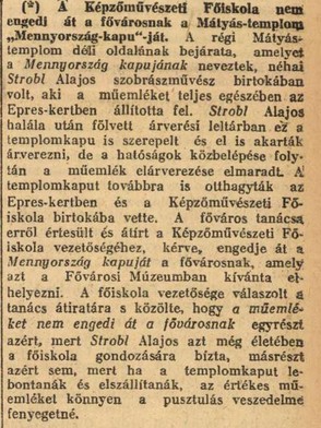 A Képzőművészeti Főiskola nem engedi át a fővárosnak a Mátyás-templom Mennyország-kapu-ját. A régi Mátyás-templom déli oldalának bejárata, amelyet a Mennyország kapujánakneveztek, néhai StroblAlajos szobrászművész birtokában volt, aki a műemléket teljes egészében az Epres-kertben állította fel.
