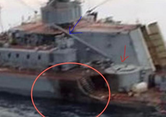 Az AK-630 lőszertárolója és az RBU-6000 környékén hatalmas tűz. A tűzoltórendszer működik. A Volna utazó helyzetben a tat felé mutat, azaz az S-300F valószínűleg nem harcolt, ha csak nem a tat irányába. Ez kb. kizárja a drónokkal lekötöttük a hajó légvédelmét Ukrán sztorit.