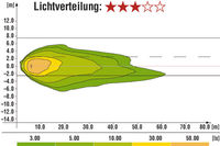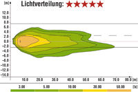 Itt van két isolux diagram, egy Osram Ultralife és egy NBP, ugyanabban a fényszóróban (H4). Míg (baloldalt) a mérhető fénymennyiség (3lux) 48 méternél "ér véget", az NBPvel, ugyanott ez még 5 lux, és 55 méter a vége.