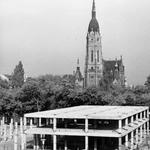 Budapest X., Halom köz, kilátás a Bánya utca 27-es számú házból a "Pataky" Művelődési ház építkezése és a Szent László-templom felé.