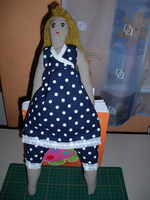 Gabo! Üdvözöllek. :) Jól sikerült kis baba. (Imádom azt a pöttyös kartont, ami rajta van. Nekem bevásárlókocsi-takaró lett belőle. Feketében, fehér pöttyökkel nem láttatok ilyet, esetleg tűpettyeset valahol?) Amúgy miért baj, ha tetltkarcsú? Épp így karakteres. Nem Barbienak készült, ugye? :)