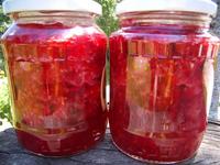 Nagyon szép szine van - én is szoktam meggy-málna keveréket csinálni, de volt hogy meggy-málna-köszméte-ribizli-feketeribizli volt a felállás. Nemrég fogyott el egy ilyen üveg, még 2008-ban készült.