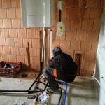 Van egy kép amin látszik a mester előtt a kazán kiállás, alatta mögötte a törölköző szárító kiállása,balra pedig megy a foldszintre a fűtés csövezés. Minden falban, padlóban, még a kötések is.... 🙃