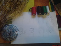Visszaolvastam . Camea ráérzett a gondolatomra. Mikor kipottyant az ufó a borítékból egy szó jutott az eszembe - nudli - Megmértem a fejet a szélessége 2,6 cm, hossza 6,7 cm . Gondoljatok el egy férfi hüvelykujjat, és abba szemet , arcot :)) Megvakartam a fejem , elővettem egy A4 -est , és körberajzoltam az ufó fejét. Aztán magam elé képzeltem IO színvilágát és elkezdtem a variációkat. De kilépni magamból nem tudtam, bocsánat. Ezért kapott egy kis pisze orrot, és a fejhez képest nagy szemet. A haj azért lett annyi amennyi mert olyan kényszerem volt, hogy szélesíteni kell a fejét. Ez simán befűzött különféle fonalak összessége , olyan sűrűn hogy egymást megtartják. Nekem a nyaka nagyon hiányzott de reméltem hogy Camea a ruhával ezt tudja korrigálni . A csipke megoldás nagyon tettszik. Közel jár a bennem munkálkodott csámpás hercegnőhöz. Talán kihasználtam volna egy jó kis cipővel eme adottságát.