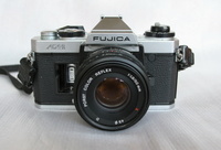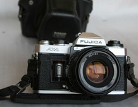 Fujica AX-1 filmes gép Porst Color Reflex 1:1.9/50 mm D objektívvel. A gép működéséről nem tudok semmit, ahogy a képen látszik az elemfedő hiányzik. Az objektívről az élességállító gyűrű hiányzik,és az objektívvédő sapka. Az objektív amúgy szép karcmentes, pormentes állapotú. Jár a géphez egy Porst bőrtok.