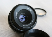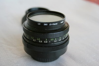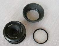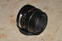 Jena DDR 50mm F2.8 Az objekítv kissé poros belül, de szakértő kezek könnyen kitisztíthatják. Jár hozzá egy gumi napellenző és egy Haze uv szűrő. Az elülső kupakja nincsen meg.