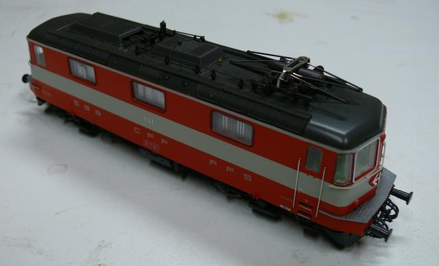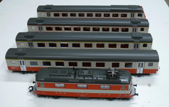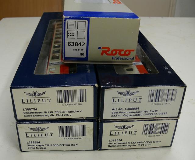 Roco 63842 katalógusszámú SBB Re 4/4 II sorozatú, 11141 pályaszámú villanymozdony Swiss-Express festéssel, valamint 4 db Liliput kocsi (AD + A + B + Bt), a katalógusszámok a fotón láthatóak (az 1. osztályú poggyászteres a dobozon hibásan 2. osztályúnak van írva). A vezérlőkocsi menetirányváltós homlokfénnyel rendelkezik.