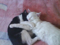 Sajnos ezen a laptopon csak pár kép van, a fekete-fehér cica veszett el, a foltjai a lényegesek. Az arca fekete, csak az állától fehéredik lefelé, az egész hasa és mind a 4 lába fehér, a hátsó 2-ben van pár fekete folt.