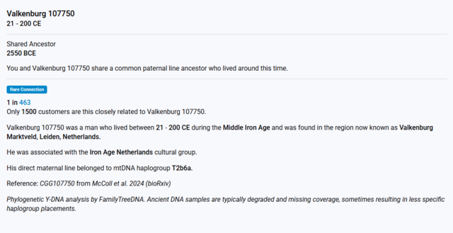 Megint kaptam egy új archaikus mintát az FTDNA cégtől, egy 2000 éve Hollandiában, Valkenburgban élt germán, 4500 éve élt, a R-DF103 haplocsoportba tartozó közös ősünk.