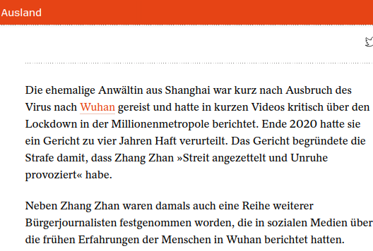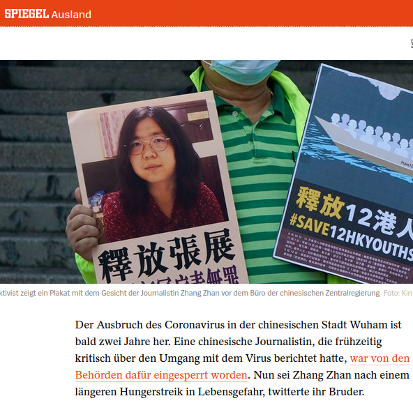 Kinaban egy jogasz ujsagironöt meg 2020-ban letartoztattak, azert mert amikor Wuhanban 2019. decembereben megjelent a virus, es csak 2020. januar 23-an zartak le a varost, es a kaosz nagy volt a komplett hitzelen lezaras miatt, no akkor a kinai ujsagironö odautazott, sokakkal bszelt, a kaoszrol stb-röl hirt adott, es 2020-ban emiatt a nyugaton szokasos ujsagcikk miatt emi egy helyszini riport volt,- 4 - negy ev letöltendö börtönbüntetesre iteltek, azzal az indoklassal, hogy vitat kezdemenyezett es nyugtalansagot keltett.