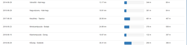 Lehet szemléletesebb lenne, ha nem fix 80-as lenne, hanem az adott felhasználó eddigi legtöbbje (túránként, bár lehetne mind a három túrát egyben kezelve is, de talán jobb túránként) lenne a 100%. Tehát, konkrétan lenne egy teljesen kitöltött csík az egyik sorban.