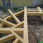 A gerendák 10x10-es méretűek lennének lefúrható talpakon, a talpszelemen szintén 10x10-es, a szarufák 5x10, a tető poliészter hullámlemez. az Oldalai pedig OSB-vel borítva.