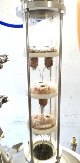 Eleve a gömb erősít, léghűtéses deflegmátorként működik, az onnan jövő flegma visszacsorog a szitatányérra, ahol az alulról jövő gőz felforralja és részleges lepárlást idéz elő már cefrefőzés alatt is.