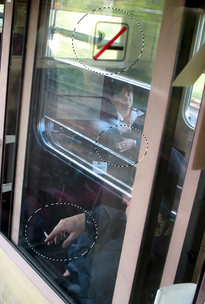 vasárnap két öreg nő fújta ránk a füstöt: ők egy kabinban ültek, mi pedig a folyosón álltunk. kinyitották az ajtót, és nyomták ki a füstöt... ha rossz kedvem lett volna, akkor valószínűleg rájuk csuktam volna az ajtót - helyette csak csúnyán néztem :)