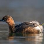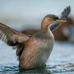 Ez egy mai vöcsök, ez a vakuzott. Két vakuval villantva, tőlem jobbra és balra egy-egy. Az elképzelésemet úgy látom a ködös idő és a tó meleg, gőzölgő vize kereszbe húzza. Olyan a fényszóródás a villanáskor, mint az autó reflektor fénye a ködben. Semmire nem jó, csak ront a látáson. A pára ráadásul felém gomolygott, a lencse tisztítást sem úsztam meg.