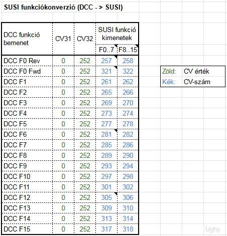 És további macera, hogy a fenti logikai konverziós táblázatot az ESU nem tette elérhetővé CV-ből, (holott szimplán hozzácsaphatták volna a funkciótáblázathoz), azaz mindenképpen ESU programmer és szoftver kell hozzá.