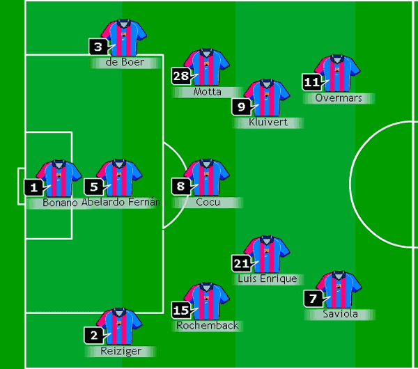 Rexach left Coco on the bench and plumped for a three man defence, with Motta, Luis Enrique, Cocu and Rochemback in the middle and Kliuvert, Saviola and Overmars up front. The manager’s attacking tactics were soon paying off as Barca opened up the Madrid defence and Kluivert came close before Luis Enrique headed a corner onto the bar in the 12th minute. Madrid were finding it difficult to put their passing game together under pressure from the Barca midfield, especially Cocu and Rochemback and they were constantly on the back foot as Overmars and Saviola in particular looked dangerous. Just as the half was finishing, Rochemback had one last chance as he worked his way through the centre of the defence, only for Cesar to make a brave save at his feet.