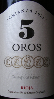 Bodegas Campoameno 5 Oros Crianza 2021. Száraz, oltalom alatt álló eredetmegjelöléssel ellátott spanyol (Rioja DOC) vörösbor. Alk. 14%, ára 2 eFt (Lidl). Tempranillo, garnacha és graciano házasítása, 12 hónapon át érlelték tölgyfahordókban palackozás előtt. Natúr parafadugó. Meggyvörös szín. Közepesen intenzív illat áfonyával, szilvával, őszi erdővel és kevés vaníliával. Kóstolva közepesen testes, ízében főként natúr szilva- és meggylekvár. Kellően élénk, átlagos minőségű savak, bársonyos tanninok. Lecsengése közepes hosszúságú, száraz, nem égető, a kortyközép ízei kis kakukkfüves fűszerességgel. IWAS-score 3/5-4/5.