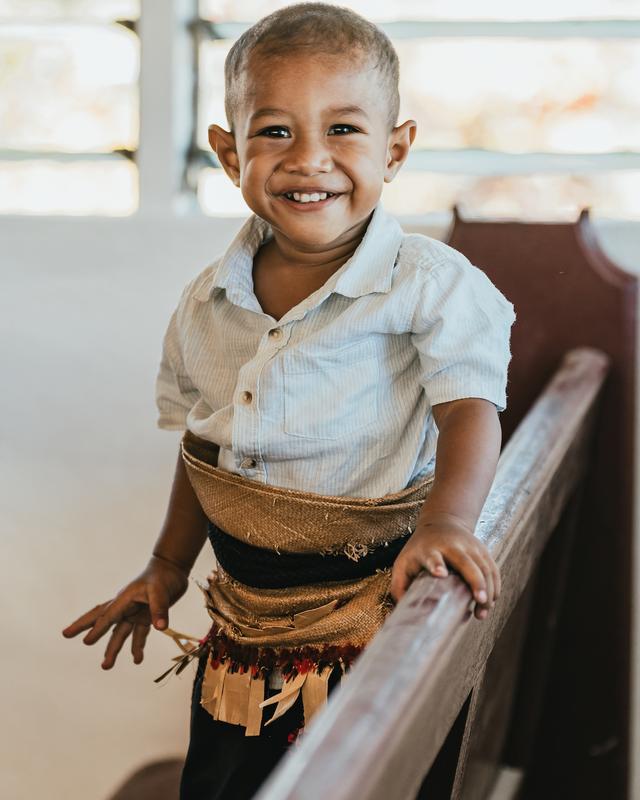 Tongán Haapai-n kisfiú a vasárnapi templomban tradicionális viseletben: