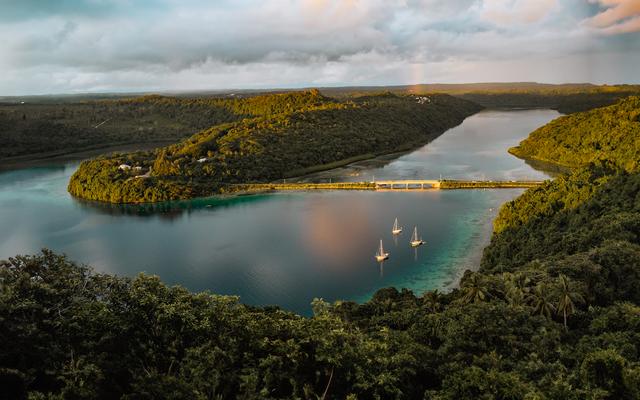 Tongán Vavau-n a Mt Talau-ról készítve a naplementében. Hajók, szivárvány és híd együtt: