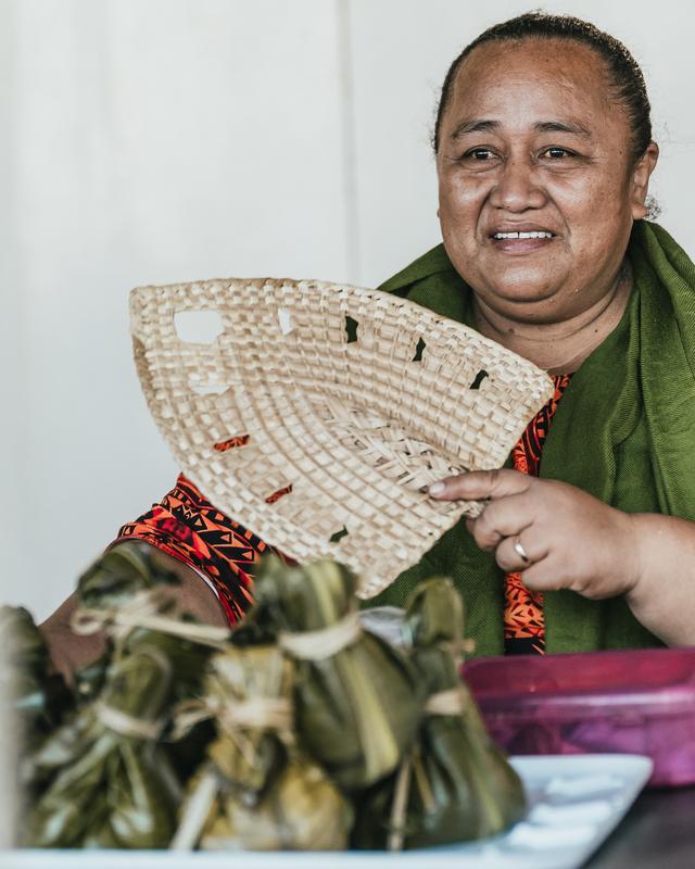 Haapai-n szombaton a piacon az árus hölgy tipikus tongai legyezővel a hagyományos lusipi nevű ételt árulja: