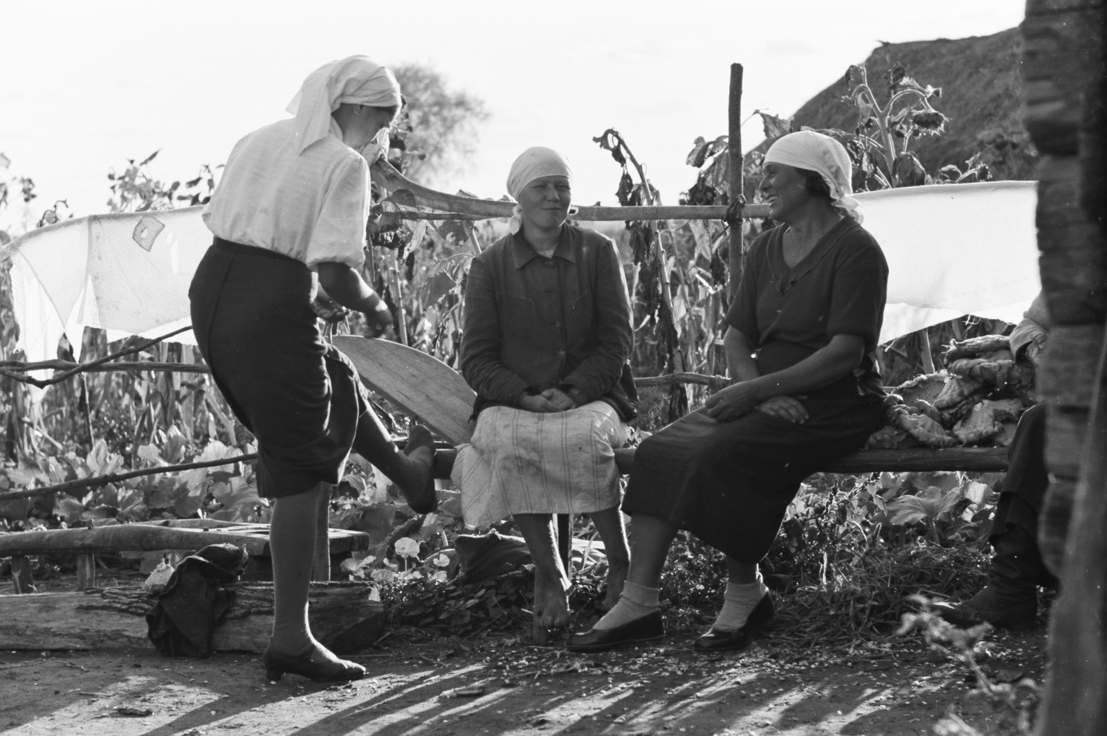 Az eszközt magam sem ismerem, de szerintem a fotó a mai Ukrajna területén készült, a képen van egy férfi is a jobb szélen (vagy nagy lábon élő csizmás nő), a hölgy és a férfi között levágott, üres napraforgó fejek.