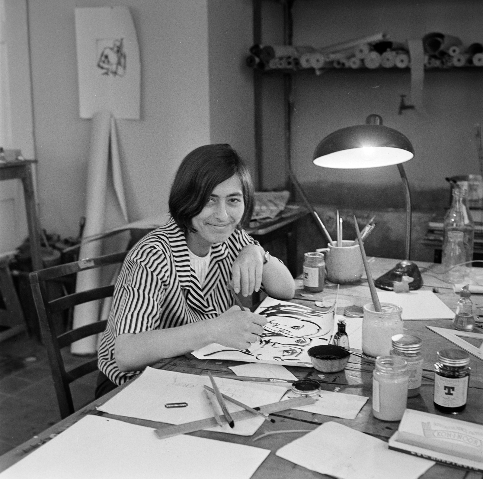 Na ez könnyű volt, akkor legyen egy nehezebb talány. https://fortepan.download/_photo/1600/fortepan_193855.jpg Érdekes és felejthetetlen alakja van az ecset-mosó tál mögötti tus üvegnek. Viszont mi lehetett a "T" betűs üvegben? Dolgozott itt vki, vagy rokona hasonló munkahelyen a hatvanas években?