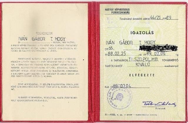 Nem láttam még ilyen diplomát. Annó a 80-as években nálunk is volt zászlóalj politikai helyettes. V. István hadnagy. Rigóból lett ht. Iszonyú jó fej srác volt. Amellett, hogy elöljáróm volt, mivel csak századparancsnok voltam, a szakmába sohasem szólt bele. De amikor Tapolcán keszonoztunk (nálunk Zegen nem volt), az első személyzet aki lement az a zászlóalj parancsnoka, törzsfőnöke, technikai helyettese, és a pol.helyettes volt. Aztán mi következtünk, a vizes gyakorlóban, és bakancsban, amit átvettünk tőlük. Ez a sorkatonák szeme láttára zajlott. Sokszor lövészet előtt is a parancsnokság lőtt először (igaz ez szabálytalan volt néha), de a sorállomány végignézte hogyan lőnek a tisztek. Jó régen volt...