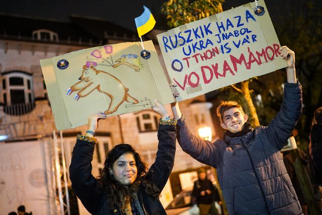 „Ruszkik haza!”, „Szlava Ukraini!” skandálásától hangos az Andrássy út!A budapesti orosz nagykövetség elé szerveztek tüntetést szombat este az orosz dezinformáció és netes propaganda ellen harcoló Ukrajna-barát civilek, a fellák. A budapesti megmozduláson ukrán zászlókkal és vicces transzparensekkel vannak az orosz nagykövetségnél. A beszédek között több ukrán katona frontról küldött videóüzenetét is bejátszották kivetítőn.