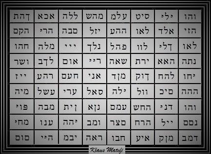 Az említett tórai részlet a Vörös-tengerrel kapcsolatba hozott mesés átkelésről szól, amit úgymond JHVH tett lehetővé népének, akik az őslakosok kincseivel felpakolva (Leviticus 3,21-22) menekültek Egyiptomból Mózes vezetésével. A korábbi három versszakasz 3x72, azaz 216 héber betűből áll. Az első angyal (JHVH, Tetragrammaton, Kozmikus Krisztus első szelleme) nevét úgy alkották meg, hogy az első szakasz első betűjéhez rendelték a második szakasz utolsó és a harmadik szakasz első betűjét. A második angyal nevének kezdőbetűje az első szakasz második betűje, a második a második szakasz utolsó előtti betűje, a harmadik pedig a harmadik szakasz második betűje. Ez az eljárás folytatódik a hátralévő további 70 angyalnév esetében is. A héber szavakat értelemszerűen jobbról balra kell olvasni. A fenti táblázat jobbfelső sarkában látható három héber betű azonos az Agrippa von Nettesheim által megadott első angyal (Vehuiah) nevével, az alatta lévő pedig a 9. angyalnévvel (Haziel).