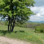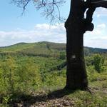 Pécs-kő, ismét száz+ éves fák, többnyire tölgyek, kilátás a Somlyó felé, háttérben a Mátra, víz, bélyegző, majd ereszkedés, az utolsó roham a cél, a Galcsik-fogadó felé!