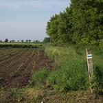 A szokásos komótos készülődés végén ezen a reggelen is háromnegyed hét után kaptam a hátamra a matyó-motyót és indultam tovább az utamon. Erre a napra egy kicsit hosszabb menetet terveztem be, mint előző napra, igyekeztem a következő napi, Szarvasig vezető út hosszát annyira megkurtítani, hogy már délre megérkezve oda délután alaposan körülnézhessek ott. Az erdő szélén visszagyalogoltam a telephelyre menő keskeny aszfaltútra, ahol a kék jelzések is fel voltak festve az útszéli fákra. A bekerített telephelynél aztán az út befordult a kapun belülre, pár méter után a semmibe továbbvezető maradék aszfaltút végét egy fémsorompó zárta le, én pedig kénytelen voltam a földek szélén húzódó pár méteres ugaron végigtörtetni az erdőszélt követve egészen a Nagymágocs határában fekvő szennyvíztelepig.