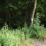Itt újra elkezdődött egy aszfaltút, ami aztán egy derékszögű kanyarral jobbra fordult pár száz lépés után, nekem pedig a GPS szerint egyenesen kellett volna továbbindulni. Igen ám, de nem volt hol! Benőtt, dzsindzsás aljú erdőbe kellett volna belépni, a csalán már most, májusban is derékig ért a fák között, és még csak csapást sem láttam arra továbbindulni! Pár lépést törtettem befelé az erdőbe, de onnan is pont olyan kilátástalannak tűnt a helyzet, mint az erdőszélről. Pedig az utolsóként látott nyilazott kék jelzés ide invitált be! Visszafordultam hát és a derékszögben jobbra térő aszfaltcsíkon battyogtam ki a faluba vezető 44114-es útra. Egyébként ez az út velem párhuzamosan haladt eddig is, talán 5-600 lépésnyi távolságban. Az utánam jövőknek azt ajánlom, itt jöjjenek végig a kerékpárúttól egészen a faluig.