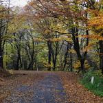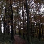 A kényelmes, széles turistaút még kapaszkodott egy sort a Kecske-hát keleti oldalában, aztán visszalejtett a Vörös-nyeregbe. A Kecske-hát oldalában értem el a szakasz legmagasabb pontját, a trekk szerint 414 méteren. Itt nem álltam meg pihenni, egy kényelmes szekérútra térve és gyengén lejtve végigoldalaztam a Kecske-hát északi oldalában is. Ekkor már háromnegyed tíz felé járt az idő, egy irtásfolton keresztüli kitekintésnél vettem észre, hogy a szél tényleg kezdi felszaggatni az addigi zárt felhőtakarót. A Kecske-hát és a Borz-hegy közötti Körtefa-nyeregtől indult meg komolyabban lefelé az út, és egyetlen hosszú ereszkedéssel, a vége felé már kissé vízmosásossá váló szekérúton letrappoltam az OKT korábbi útvonalára, a hegyek között kanyargó erdei aszfaltútra. 146 méter magasan értem el az aszfaltcsíkot.