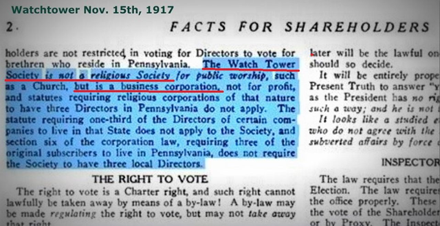 "...Tájékoztató a részvényesek számára:"Az Őrtorony Társulat nem egy nyilvános imádatnak helyt adó vallási társaság, mint egy egyház, hanem egy üzleti vállalkozás..."