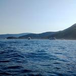 És az öblön túl is érdemes kiemelni két "strandot", melyek a nyílt tengerről közelíthetők meg: az egyik az Arany-öböl (Zlatna uvala), a másik maga a Kék-barlang és környéke, bár ez utóbbiról külön posztban fogok majd beszámolni. Az Arany-öböl a barlanghoz legközelebb található, kristálytiszta vízű keskeny és kicsi öböl, ahová sokan betérnek a barlanghoz látogatók közül. Érdemes is, meleg és viszonylag csendes a vize, tisztán látszik a meder, szépek a halak (több búvárt is láttunk itt), hangulatos a környék. Aki saját csónakkal megy a barlanghoz, ezt a helyet feltétlenül illessze be a napirendi pontok közé:
