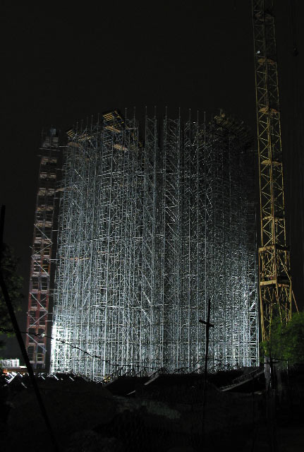 Ami az építést, annak időtartamát és kinézetét illeti: eredetileg a kelyhet a földön tervezték megépíteni, majd egyben felemelni. Menet közben váltottak koncepciót, biztonságosabbnak ítélve azt a megoldást, hogy nem mozgatnak egy ekkora tömeget, hanem fent építik meg. Az állványerdő a kehely középső, kisebb átmérőjű részét támasztja alá, ezt fent zsaluzzák és öntik ki betonnal, majd a nagyobb átmérőjű részt a földön szerelt gerezdekből függesztik köré, és kötik össze egy szerkezetté (mély- és magasépítők, kéretik nem röhögni a szakszerűségemen).